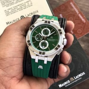 Step into modern luxury with the Maurice Lacroix Aikon Quartz Chronograph 44mm, now available in an exclusive green dial and rubber strap edition. Designed with a bold stainless steel case, this watch showcases the perfect blend of sporty aesthetics and Swiss-made performance — ideal for today’s confident, style-forward man.